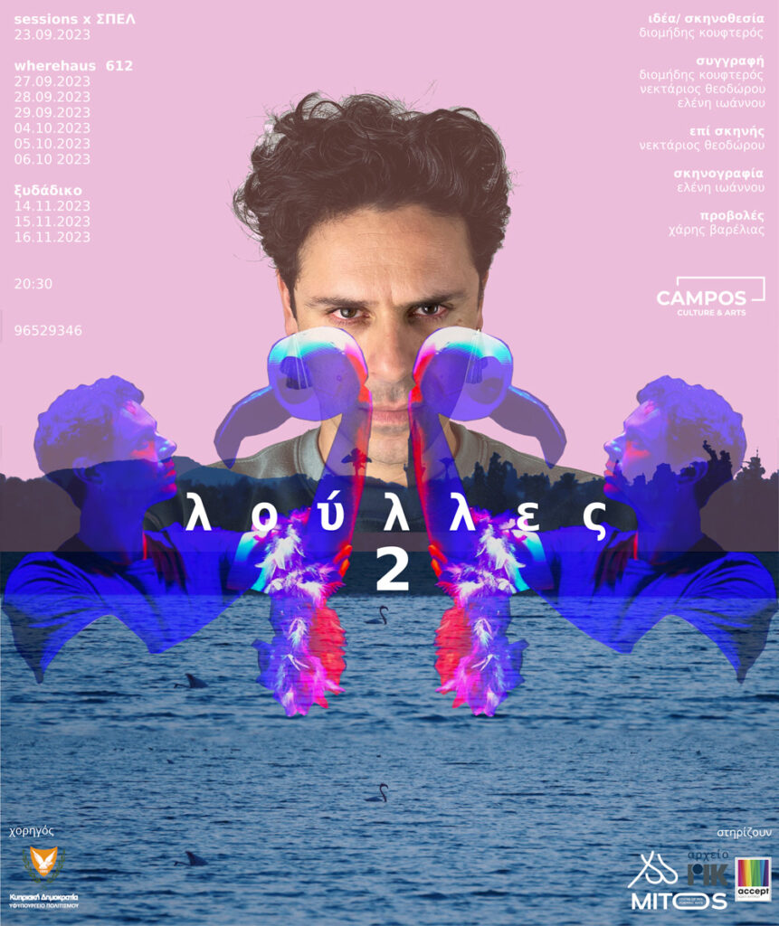 The first version of the play was presented in workshop form, as a staged reading, within the residency program theYard.residency.23 of the MITOS Center of Performing Arts, in Spring 2023. Loulles 2 was later presented at Wherehaus 612 in Nicosia, Xydadiko in Limassol, and within Sessions x SPEL, a series of queer actions at the State Gallery of Contemporary Art – SPEL.